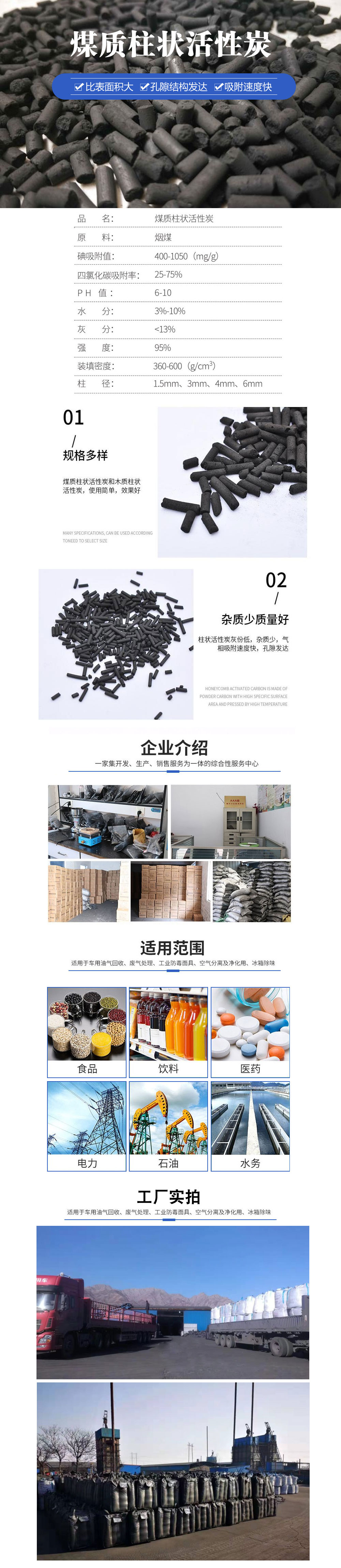 柱狀活性炭是以煤炭為原料、以煤油為粘合劑、經(jīng)磨粉、混配、擠壓成形、炭化、活化而成的圓柱形活性炭。該產(chǎn)品比表面積大、孔隙發(fā)達(dá)、強(qiáng)度高、吸附能力強(qiáng)、化學(xué)穩(wěn)定性好、可廣泛應(yīng)用于化工、制藥、食品等各種氣體的有害有毒及微生物凈化過(guò)濾、對(duì)低拂點(diǎn)的苯類(lèi)、醇類(lèi)、四氯化碳、三氯甲烷等有害氣體有很好的吸附作用,活性炭吸